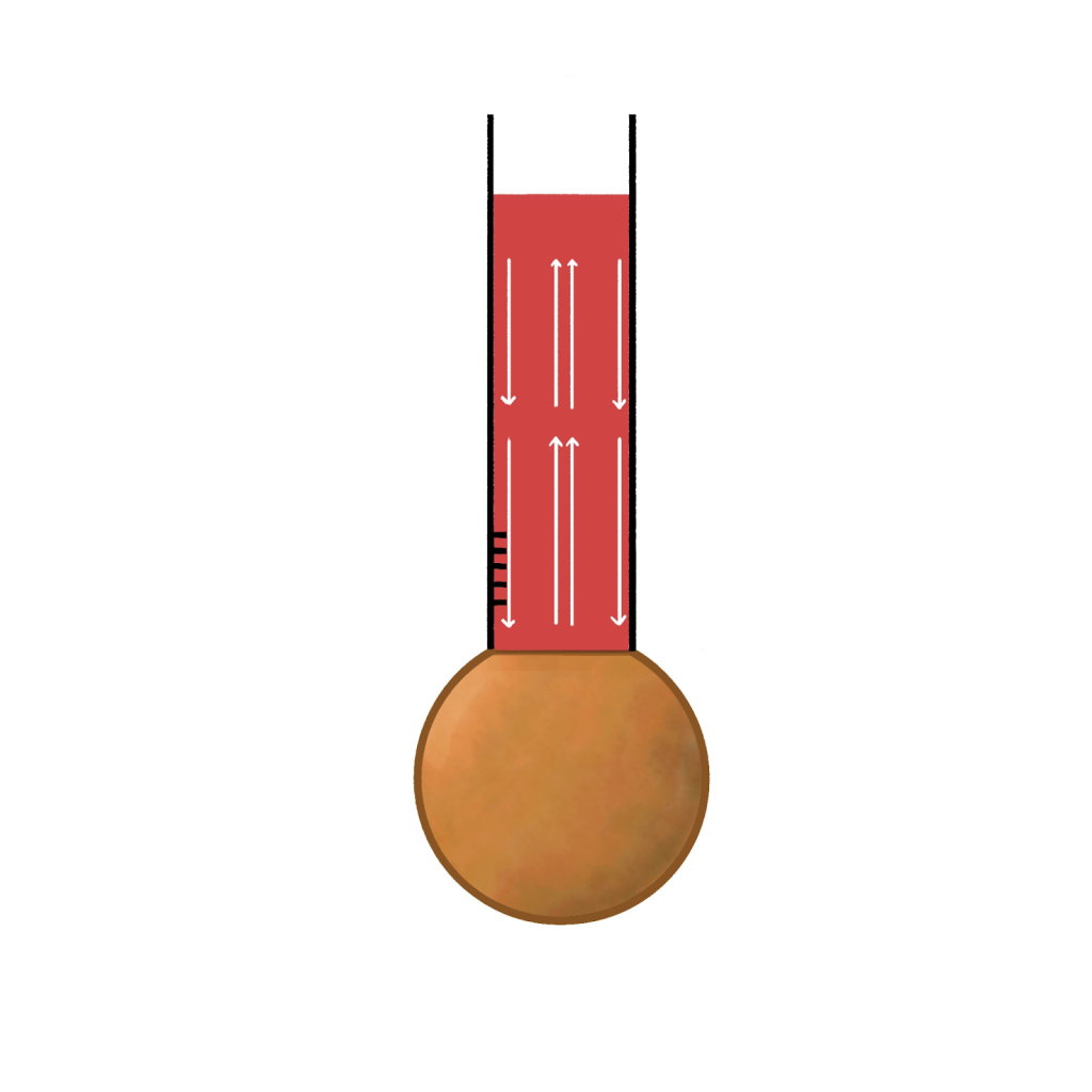 On a sunny day, Thompson used an old, poorly stored thermometer with a spherical base over 10 cm in diameter. This thermometer hadn’t been used for a long time and was poorly maintained, so the liquid inside was not clean, with dust particles floating in it. Even so, because the liquid was colored, the dust wasn’t particularly noticeable at first glance. However, after Thompson heated the thermometer and left it by the window to cool down, sunlight passed through the thermometer, making the dust inside the liquid highly visible. To his surprise, he observed the dust moving rapidly and in a very orderly pattern: an upward current in the center and a downward current along the sides (as illustrated below).