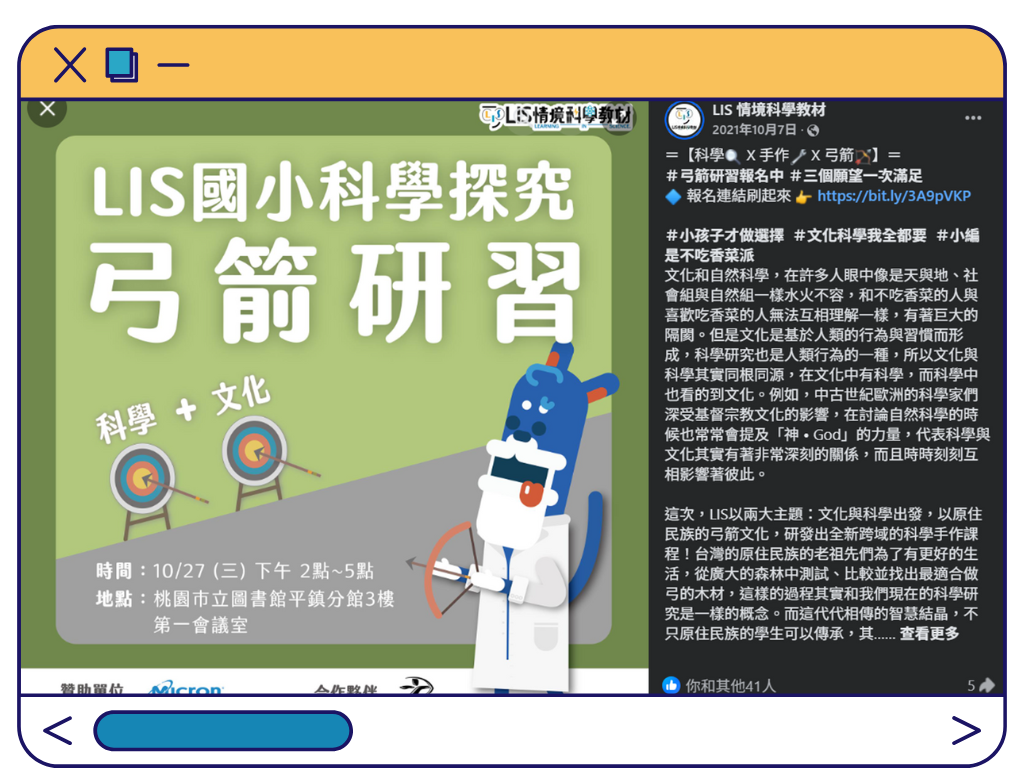 這次的研習中,LIS將分享獨家的科學手作探究課程!以原住民族弓箭為主題,分享如何透過製作弓箭來帶領學生進行科學探究。弓,不就是根木頭嗎?為什麼射出去這麼有力?一把弓射出一支箭,這裡面蘊含著物體型變和彈力等大學問。透過我們開發的課程,學生可以在做中學,既學到彈力,也享受到手作的樂趣!